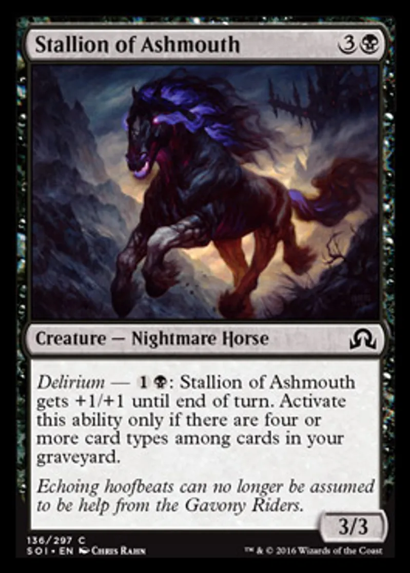 | Oracle Text | Delirium — {{1}}{{b}}: Stallion of Ashmouth gets +1/+1 until end of turn. Activate this ability only if there are four or more card types among cards in your graveyard. | ||