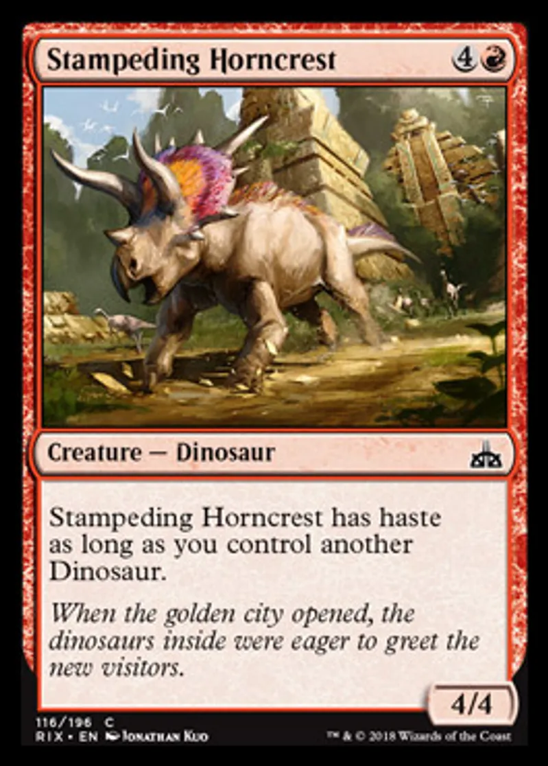 Stampeding Horncrest is a Common in the set Rivals of Ixalan.