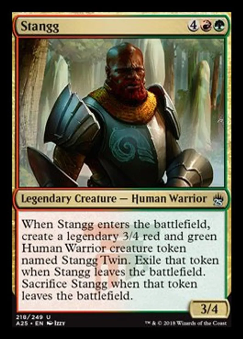 | Oracle Text | When Stangg enters the battlefield, create a legendary 3/4 red and green Human Warrior creature token named Stangg Twin. Exile that token when Stangg leaves the battlefield. Sacrifice Stangg when that token leaves the battlefield. | ||