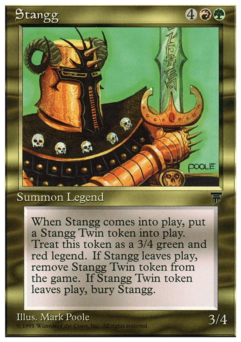 | Oracle Text | When Stangg enters the battlefield, put a legendary 3/4 red and green Human Warrior creature token named Stangg Twin onto the battlefield. When Stangg leaves the battlefield, exile that token. When that token leaves the battlefield, sacrifice Stangg. | ||