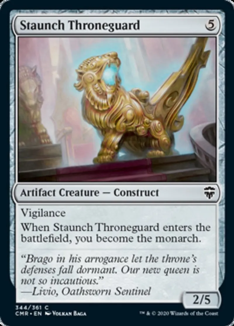 When Staunch Throneguard enters the battlefield, you become the monarch. | ||