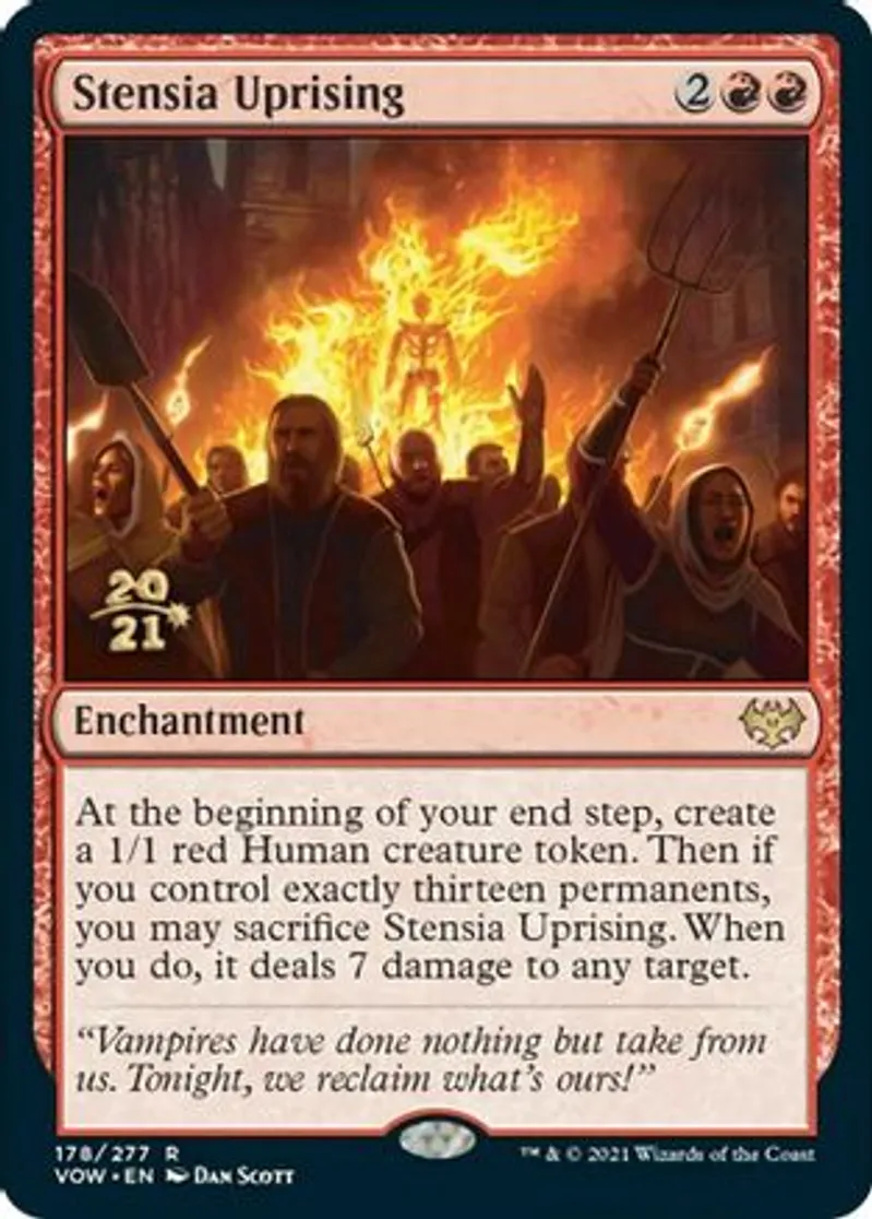 | Oracle Text | At the beginning of your end step, create a 1/1 red Human creature token. Then if you control exactly thirteen permanents, you may sacrifice Stensia Uprising. When you do, it deals 7 damage to any target. | ||