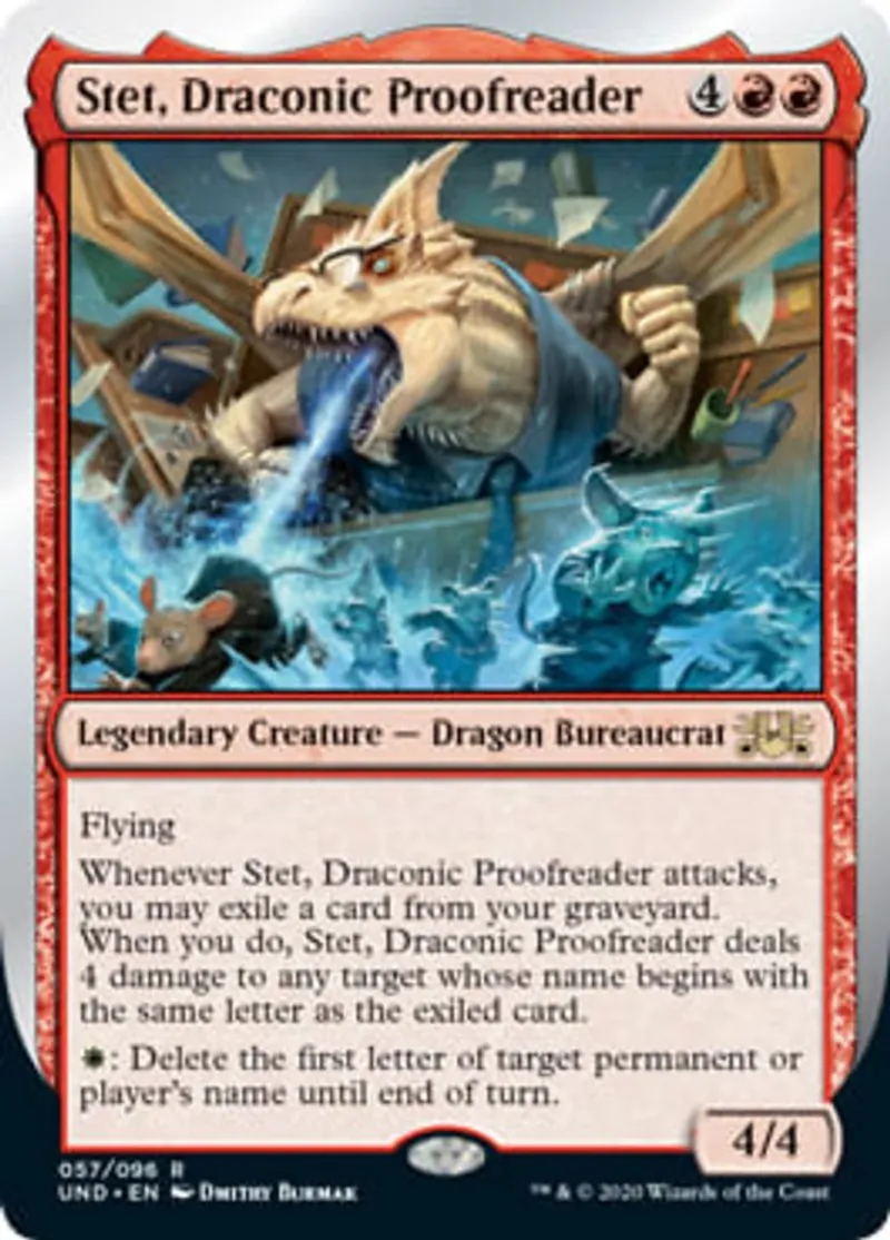 Whenever Stet, Draconic Proofreader attacks, you may exile a card from your graveyard. When you do, Stet, Draconic Proofreader deals 4 damage to any target whose name begins with the same letter as the exiled card.
