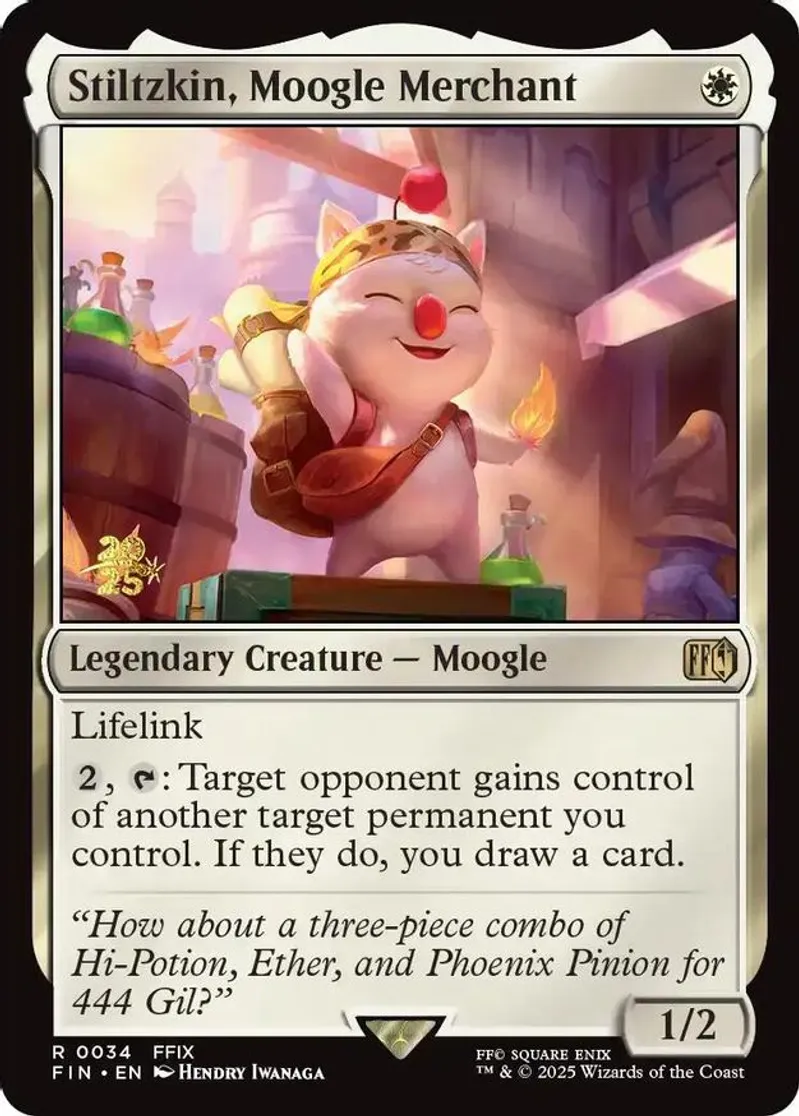 Magic: the Gathering (mtg) Rare legendary creature — moogle Stiltzkin, Moogle Merchant from Prerelease Cards (pPRE) last updated 2025-12-05 15:18:36
