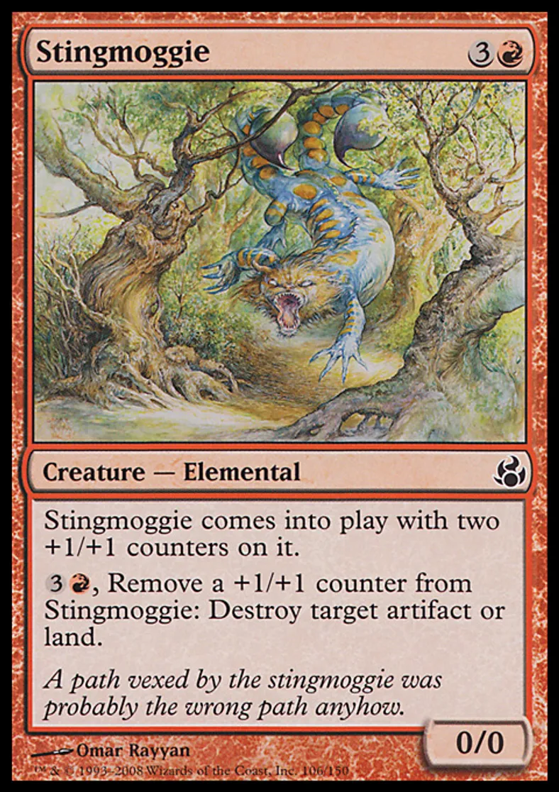 | Oracle Text | Stingmoggie enters the battlefield with two +1/+1 counters on it. {{3}}{{r}}, Remove a +1/+1 counter from Stingmoggie: Destroy target artifact or land. | ||
