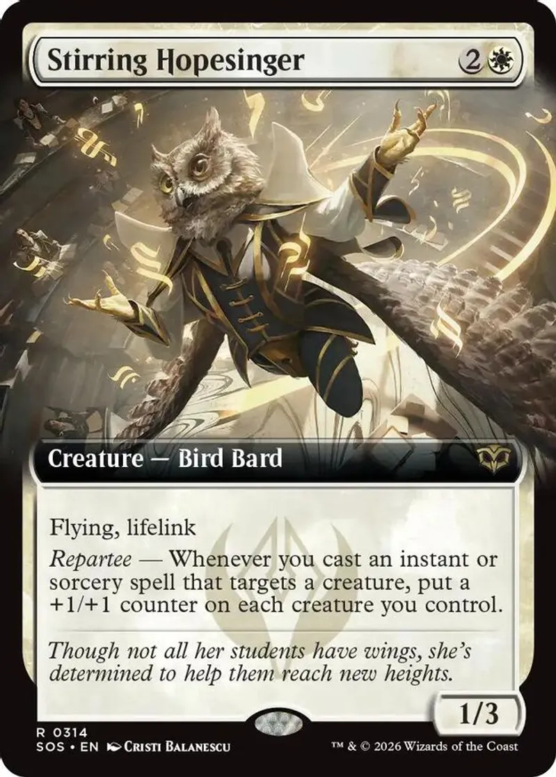 Magic: the Gathering (mtg) Rare creature — bird bard Stirring Hopesinger from Secrets of Strixhaven (SOS) last updated 2026-04-16 23:15:09