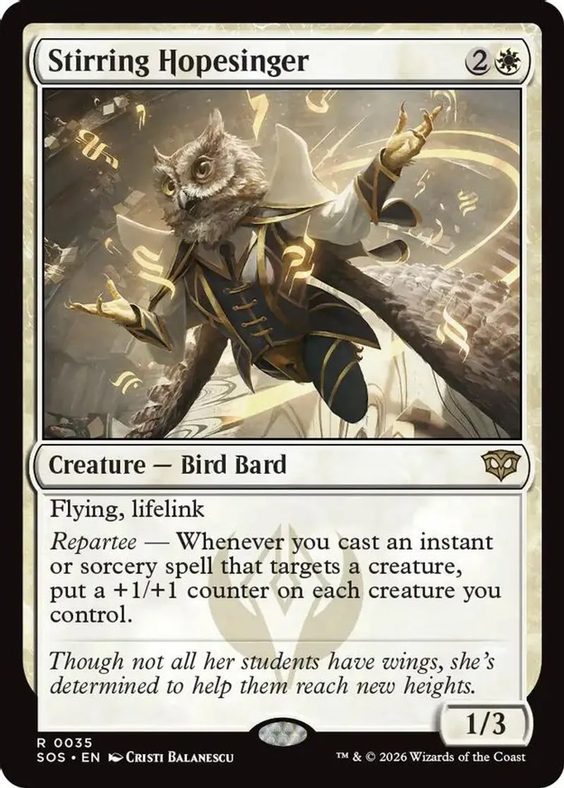 Magic: the Gathering (mtg) Rare creature — bird bard Stirring Hopesinger from Secrets of Strixhaven (SOS) last updated 2026-04-16 23:15:09