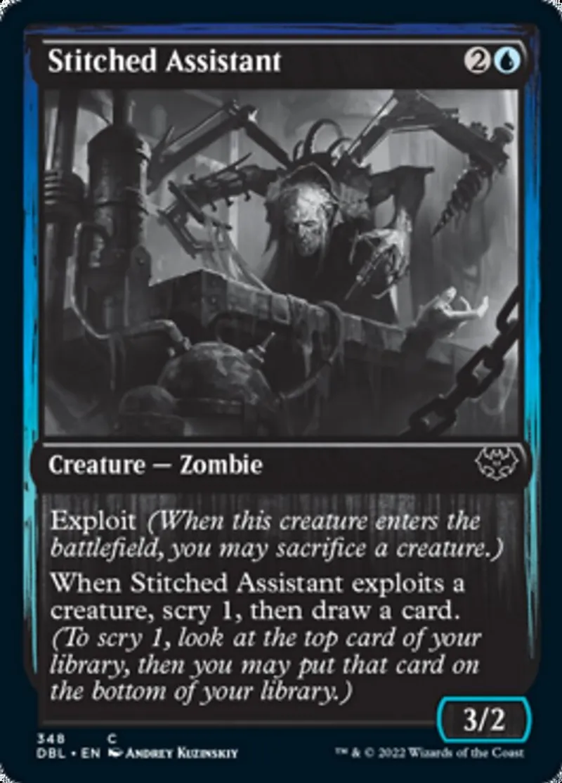 When Stitched Assistant exploits a creature, scry 1, then draw a card. (To scry 1, look at the top card of your library, then you may put that card on the bottom of your library.) | ||