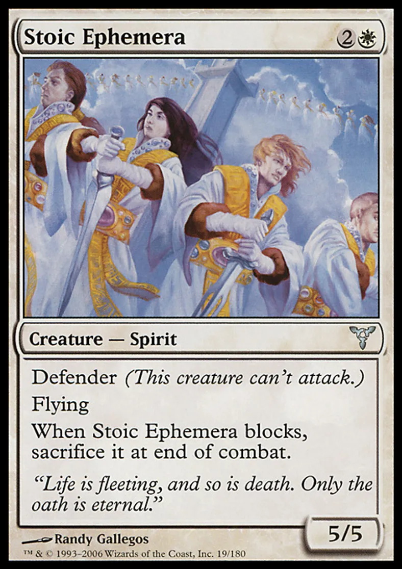 | Oracle Text | Defender (This creature can't attack.) Flying When Stoic Ephemera blocks, sacrifice it at end of combat. | ||