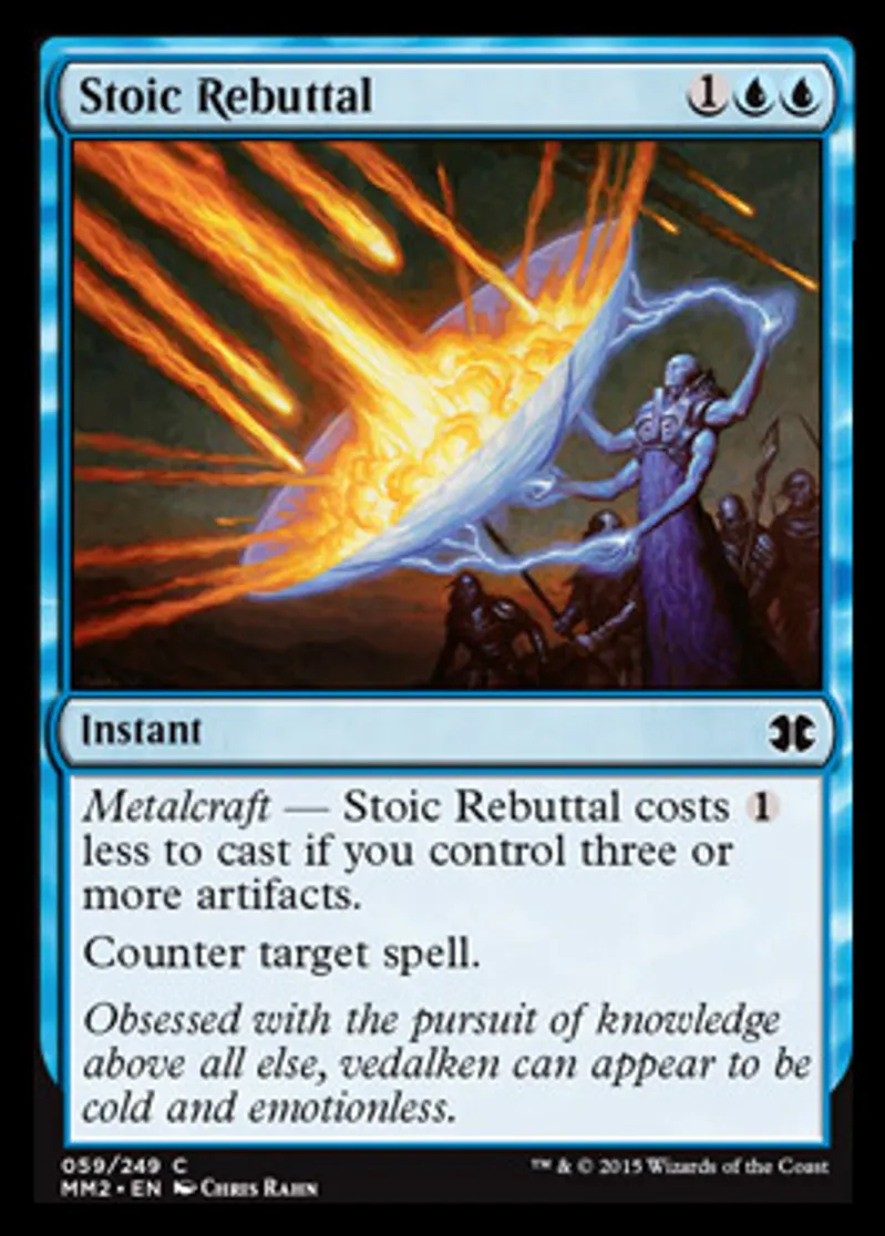 | Oracle Text | Metalcraft — Stoic Rebuttal costs {{1}} less to cast if you control three or more artifacts. Counter target spell. | ||