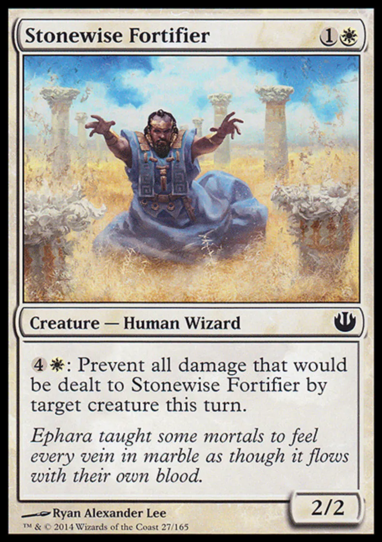 | Oracle Text | {{4}}{{w}}: Prevent all damage that would be dealt to Stonewise Fortifier by target creature this turn. | ||