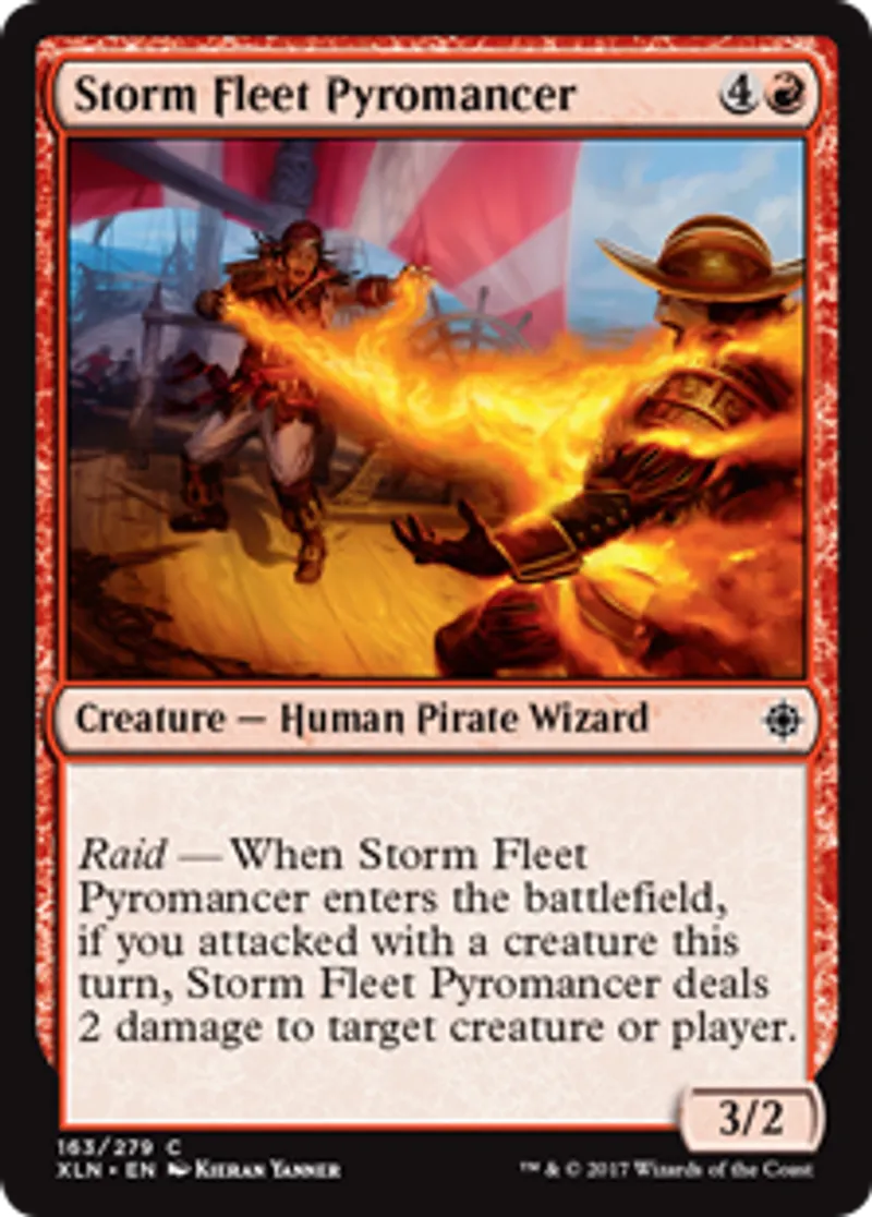 | Oracle Text | Raid — When Storm Fleet Pyromancer enters the battlefield, if you attacked with a creature this turn, Storm Fleet Pyromancer deals 2 damage to target creature or player. | ||