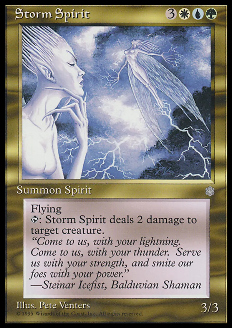 | Oracle Text | Flying {{t}}: Storm Spirit deals 2 damage to target creature. | ||