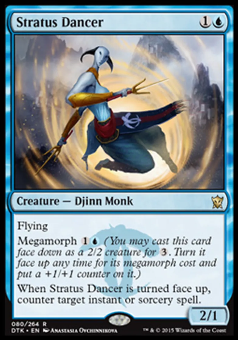| Oracle Text | Flying Megamorph {{1}}{{u}} (You may cast this card face down as a 2/2 creature for {{3}}. Turn it face up any time for its megamorph cost and put a +1/+1 counter on it.) When Stratus Dancer is turned face up, counter target instant or sorcery spell. | ||