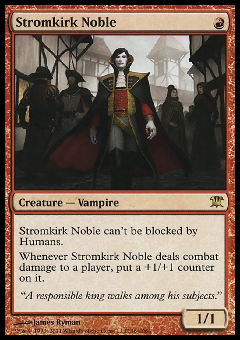 | Oracle Text | Stromkirk Noble can't be blocked by Humans. Whenever Stromkirk Noble deals combat damage to a player, put a +1/+1 counter on it. | ||