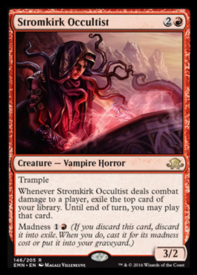 | Oracle Text | Trample Whenever Stromkirk Occultist deals combat damage to a player, exile the top card of your library. Until end of turn, you may play that card. Madness {{1}}{{r}} (If you discard this card, discard it into exile. When you do, cast it for its madness cost or put it into your graveyard.) | ||