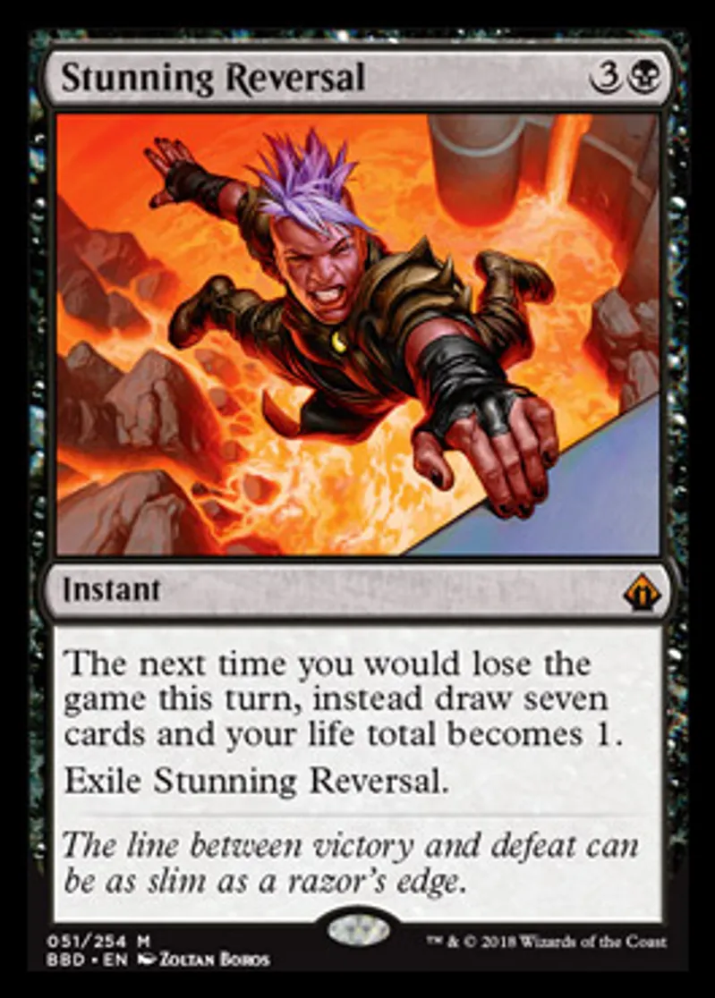 | Oracle Text | The next time you would lose the game this turn, instead draw seven cards and your life total becomes 1. Exile Stunning Reversal. | ||