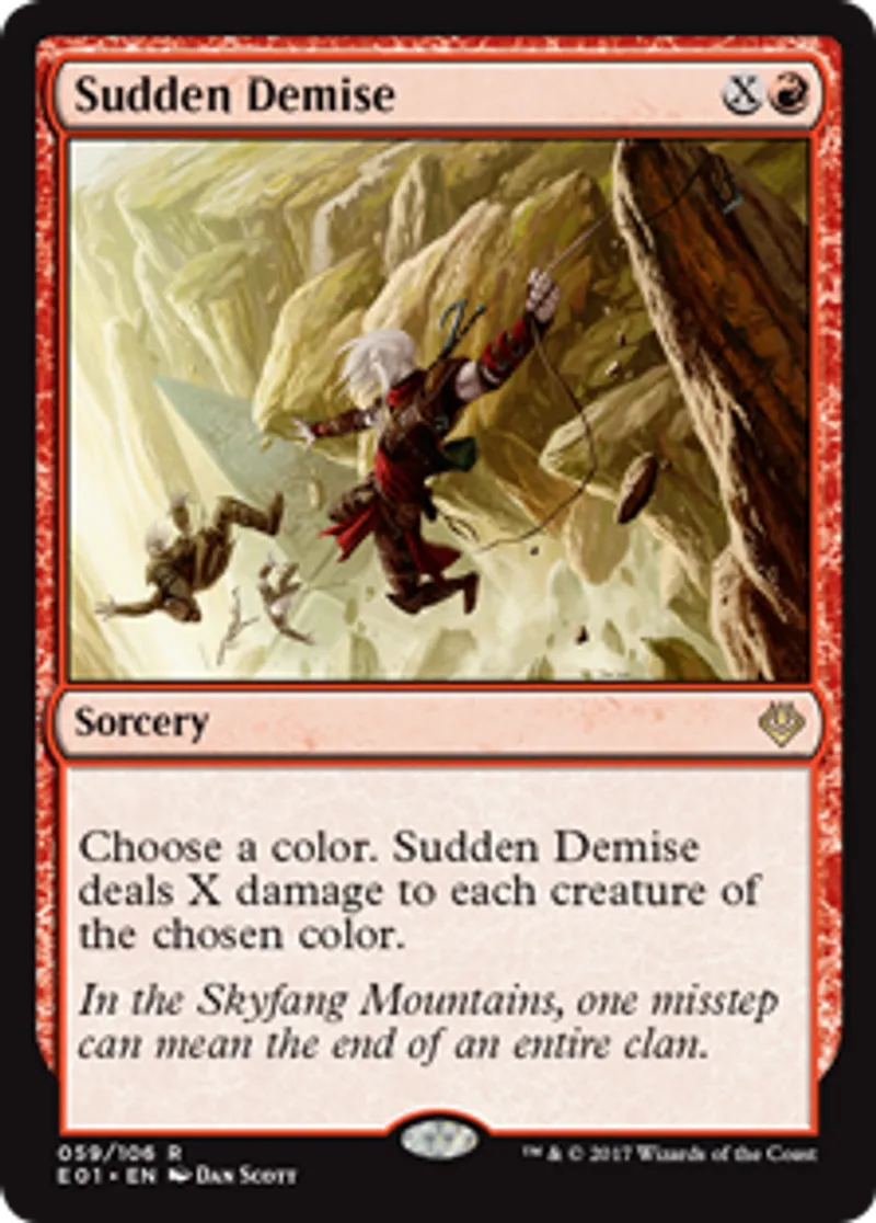 | Oracle Text | Choose a color. Sudden Demise deals X damage to each creature of the chosen color. | ||