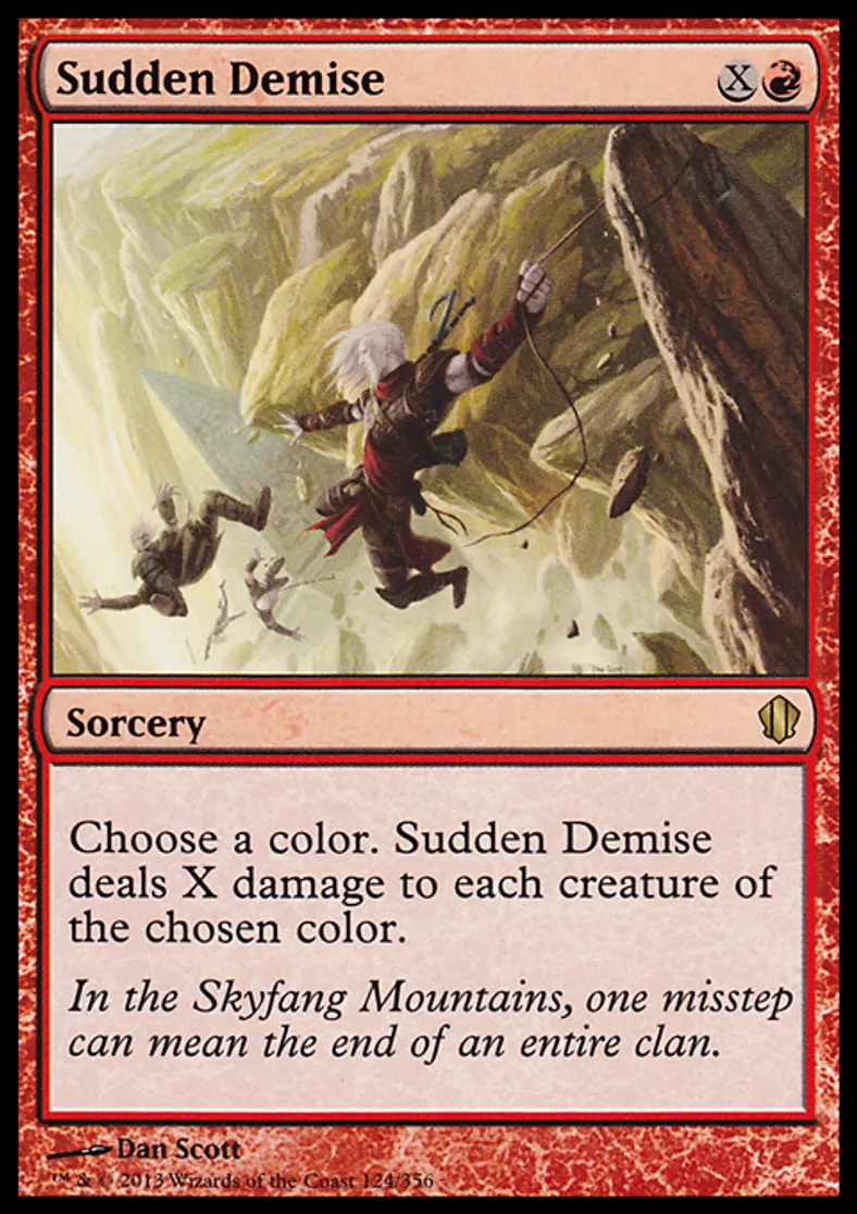 | Oracle Text | Choose a color. Sudden Demise deals X damage to each creature of the chosen color. | ||