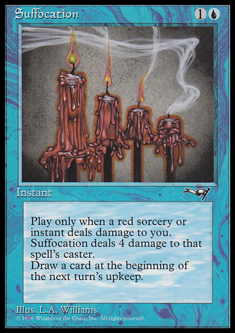 | Oracle Text | Cast Suffocation only if you were dealt damage this turn by a red instant or sorcery spell. Suffocation deals 4 damage to the controller of the last red instant or sorcery spell that dealt damage to you this turn. Draw a card at the beginning of the next turn's upkeep. | ||