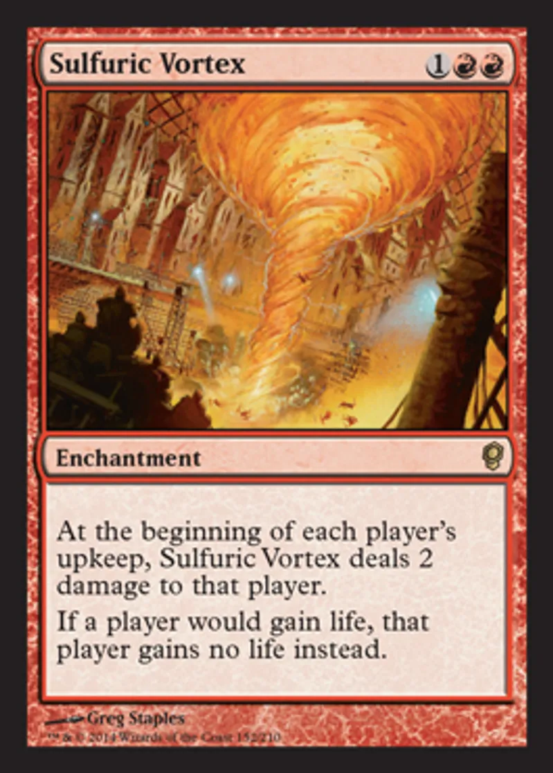 | Oracle Text | At the beginning of each player's upkeep, Sulfuric Vortex deals 2 damage to that player. If a player would gain life, that player gains no life instead. | ||