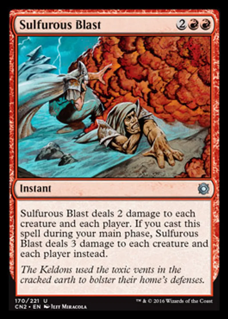 | Oracle Text | Sulfurous Blast deals 2 damage to each creature and each player. If you cast this spell during your main phase, Sulfurous Blast deals 3 damage to each creature and each player instead. | ||
