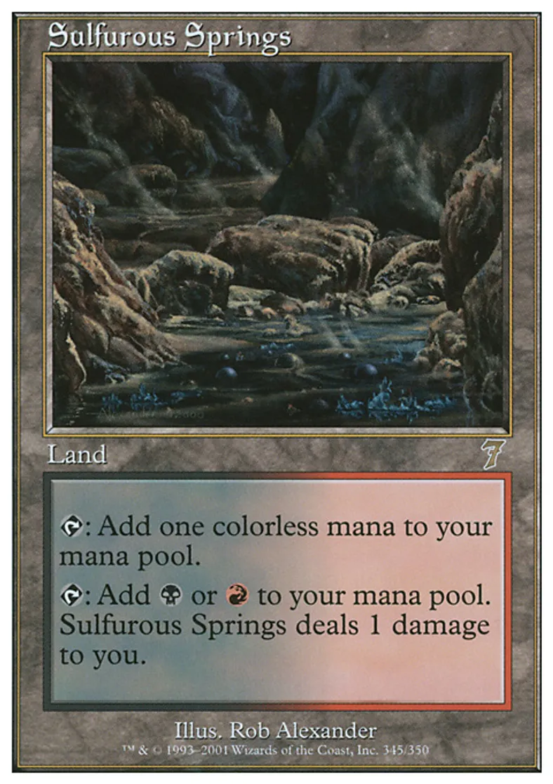 | Oracle Text | {{t}}: Add {{1}} to your mana pool. {{t}}: Add {{b}} or {{r}} to your mana pool. Sulfurous Springs deals 1 damage to you. | ||