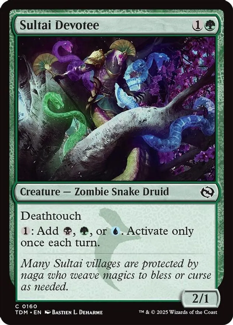 Magic: the Gathering (mtg) Common creature — zombie snake druid Sultai Devotee from Tarkir: Dragonstorm (TDM) last updated 2026-02-21 15:38:36