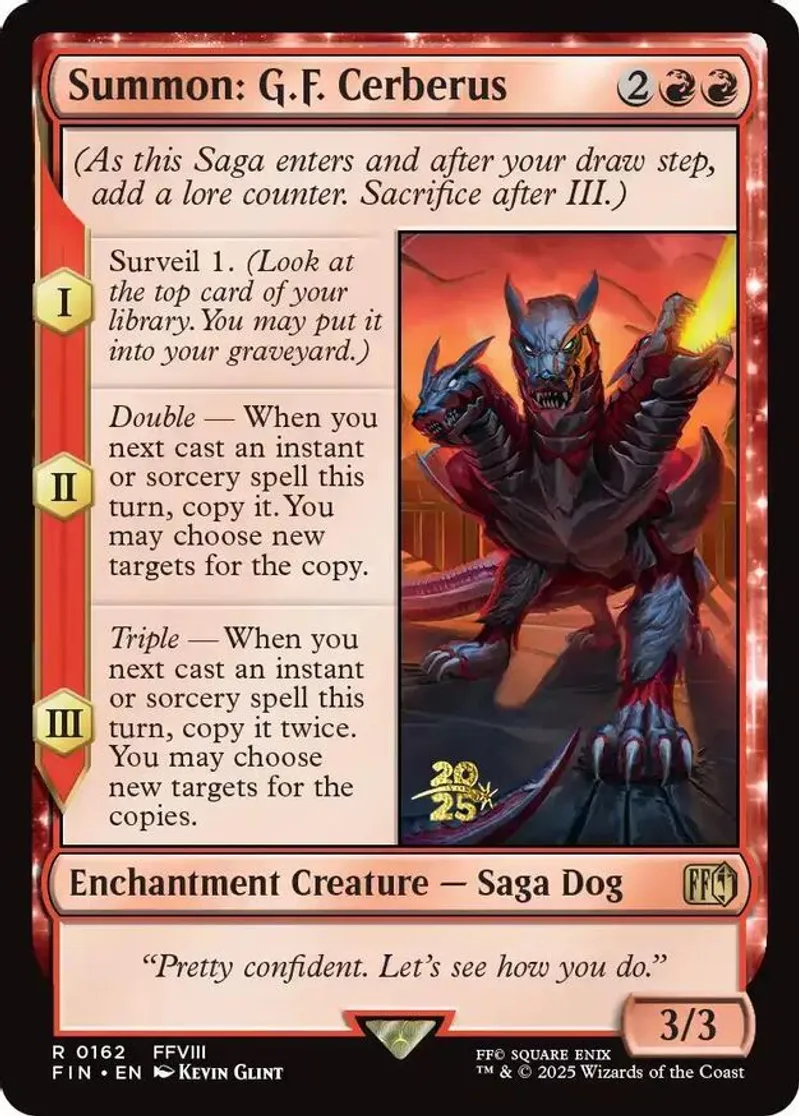 Magic: the Gathering (mtg) Rare enchantment creature — saga dog Summon: G.F. Cerberus from Prerelease Cards (pPRE) last updated 2025-12-04 14:20:06