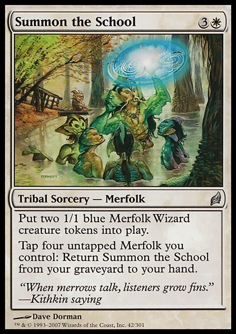 | Oracle Text | Put two 1/1 blue Merfolk Wizard creature tokens onto the battlefield. Tap four untapped Merfolk you control: Return Summon the School from your graveyard to your hand. | ||