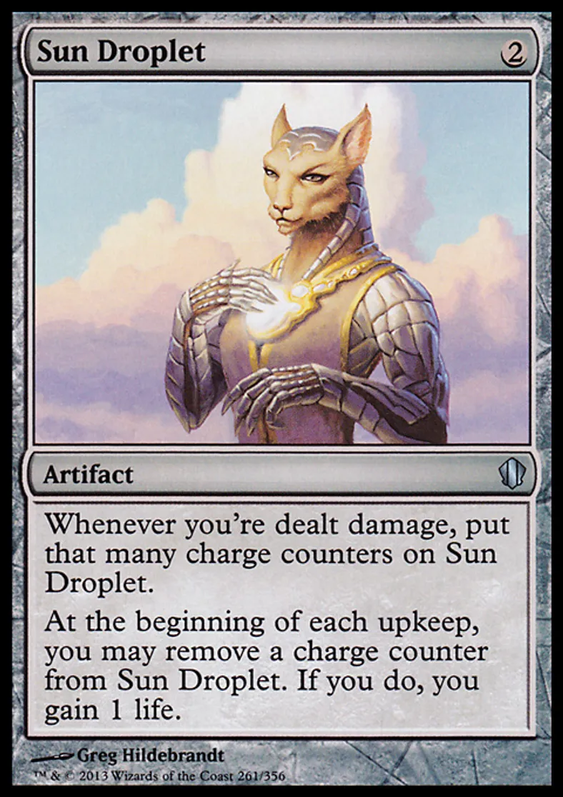 | Oracle Text | Whenever you're dealt damage, put that many charge counters on Sun Droplet. At the beginning of each upkeep, you may remove a charge counter from Sun Droplet. If you do, you gain 1 life. | ||