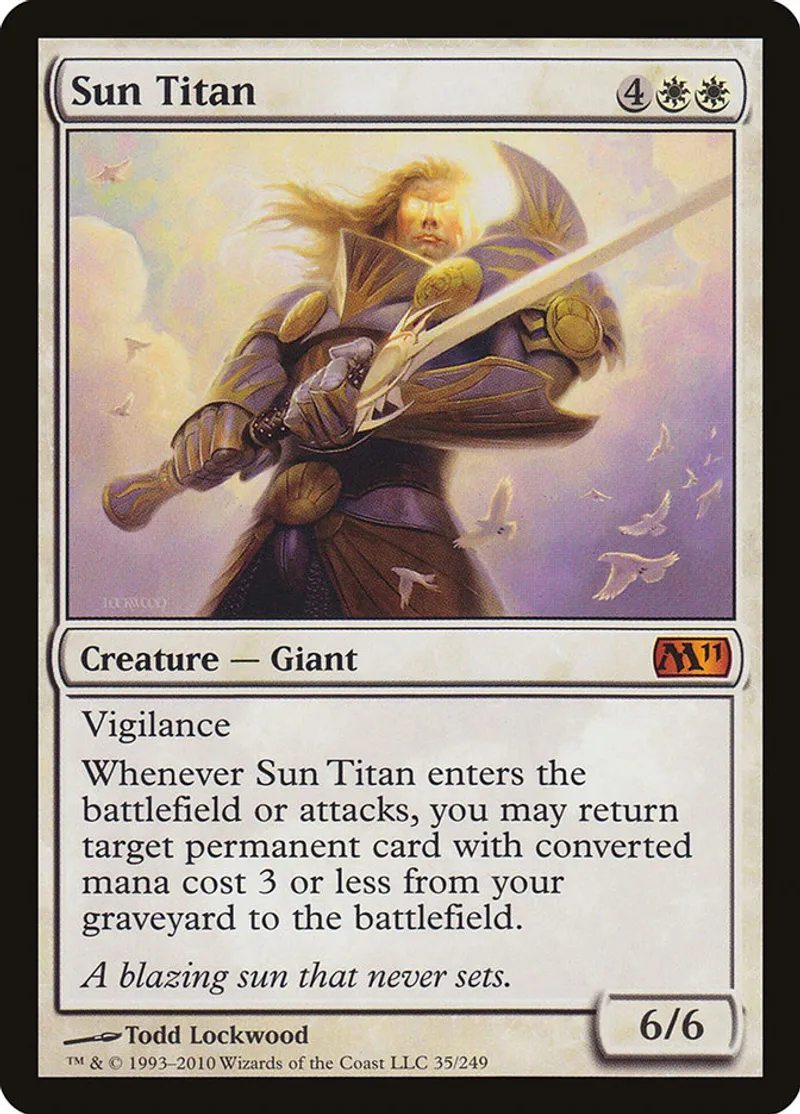 Whenever Sun Titan enters the battlefield or attacks, you may return target permanent card with mana value 3 or less from your graveyard to the battlefield. | ||