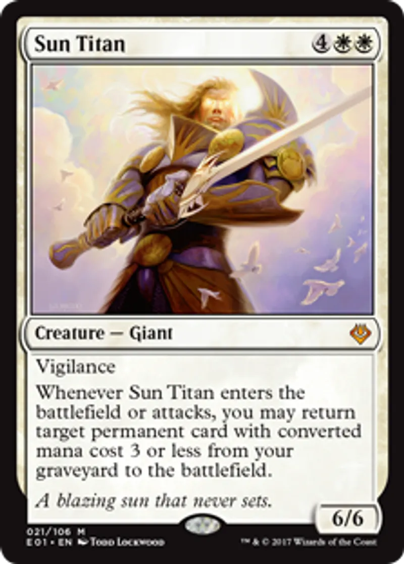 | Oracle Text | Vigilance Whenever Sun Titan enters the battlefield or attacks, you may return target permanent card with converted mana cost 3 or less from your graveyard to the battlefield. | ||