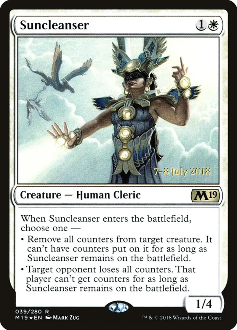 | Oracle Text | When Suncleanser enters the battlefield, choose one —\r\n\r\n• Remove all counters from target creature. It can’t have counters put on it for as long as Suncleanser remains on the battlefield.\r\n\r\n• Target opponent loses all counters. That player can’t get counters for as long as Suncleanser remains on the battlefield. | ||