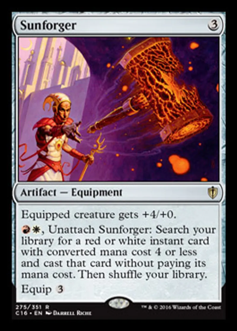 | Oracle Text | Equipped creature gets +4/+0. {{r}}{{w}}, Unattach Sunforger: Search your library for a red or white instant card with converted mana cost 4 or less and cast that card without paying its mana cost. Then shuffle your library. Equip {{3}} | ||