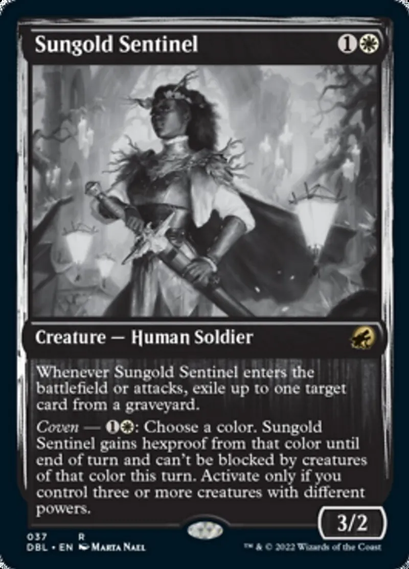 Coven — {1}{W}: Choose a color. Sungold Sentinel gains hexproof from that color until end of turn and can't be blocked by creatures of that color this turn. Activate only if you control three or more creatures with different powers. | ||