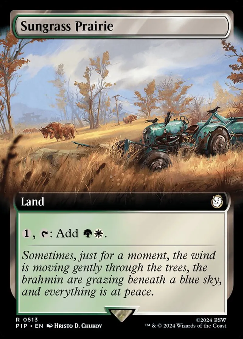 Magic: the Gathering (mtg) rare Land Sungrass Prairie from Universes Beyond: Fallout (PIP) last updated 2025-12-13 15:57:31