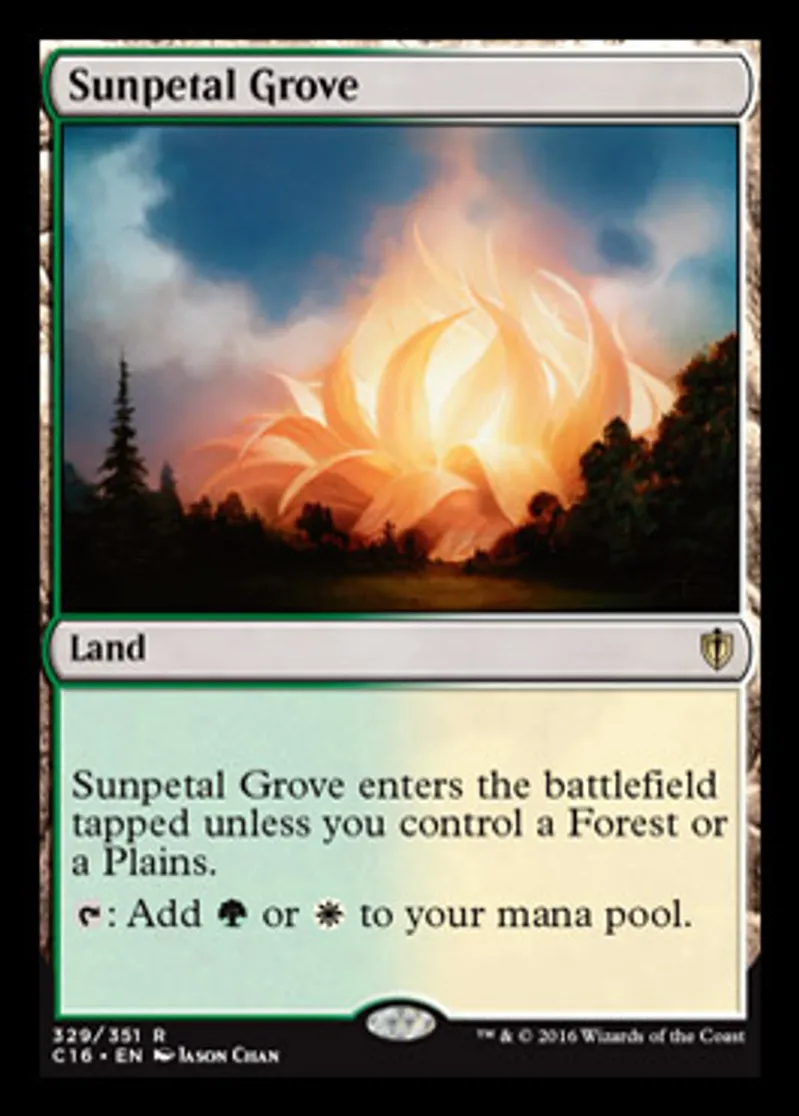 | Oracle Text | Sunpetal Grove enters the battlefield tapped unless you control a Forest or a Plains. {{t}}: Add {{g}} or {{w}} to your mana pool. | ||