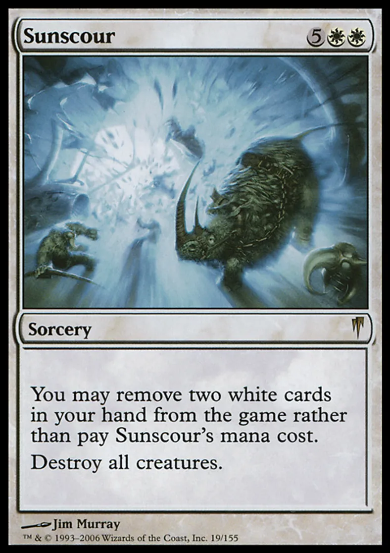 | Oracle Text | You may exile two white cards from your hand rather than pay Sunscour's mana cost. Destroy all creatures. | ||