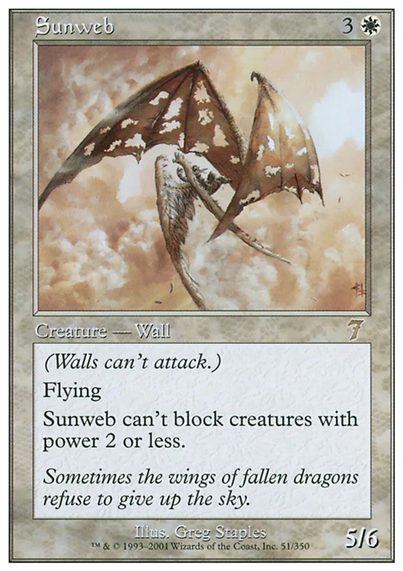 | Oracle Text | Defender (This creature can't attack.) Flying Sunweb can't block creatures with power 2 or less. | ||