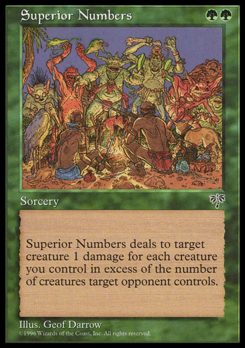 | Oracle Text | Superior Numbers deals damage to target creature equal to the number of creatures you control in excess of the number of creatures target opponent controls. | ||