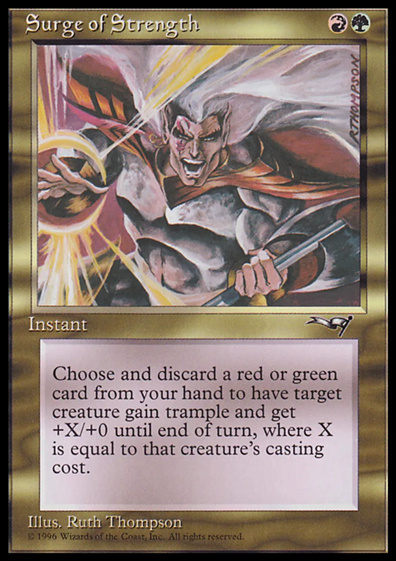 | Oracle Text | As an additional cost to cast Surge of Strength, discard a red or green card. Target creature gains trample and gets +X/+0 until end of turn, where X is that creature's converted mana cost. | ||