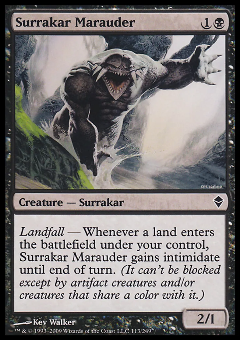 | Oracle Text | Landfall — Whenever a land enters the battlefield under your control, Surrakar Marauder gains intimidate until end of turn. (It can't be blocked except by artifact creatures and/or creatures that share a color with it.) | ||