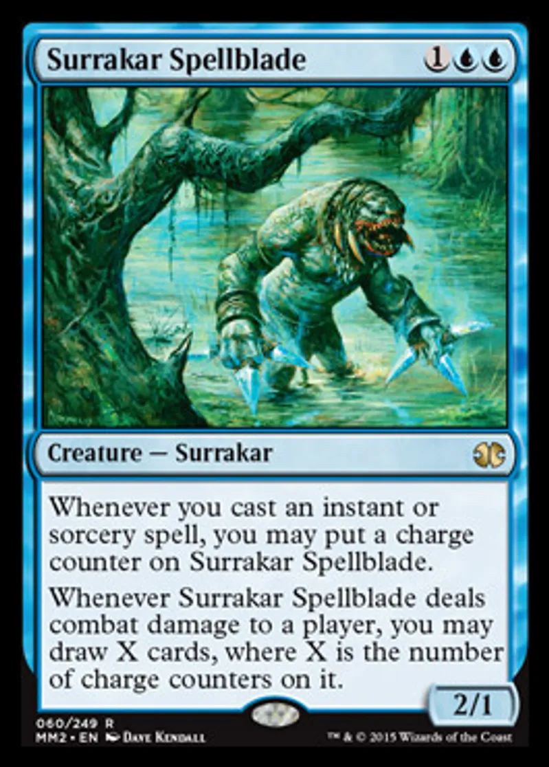 | Oracle Text | Whenever you cast an instant or sorcery spell, you may put a charge counter on Surrakar Spellblade. Whenever Surrakar Spellblade deals combat damage to a player, you may draw X cards, where X is the number of charge counters on it. | ||