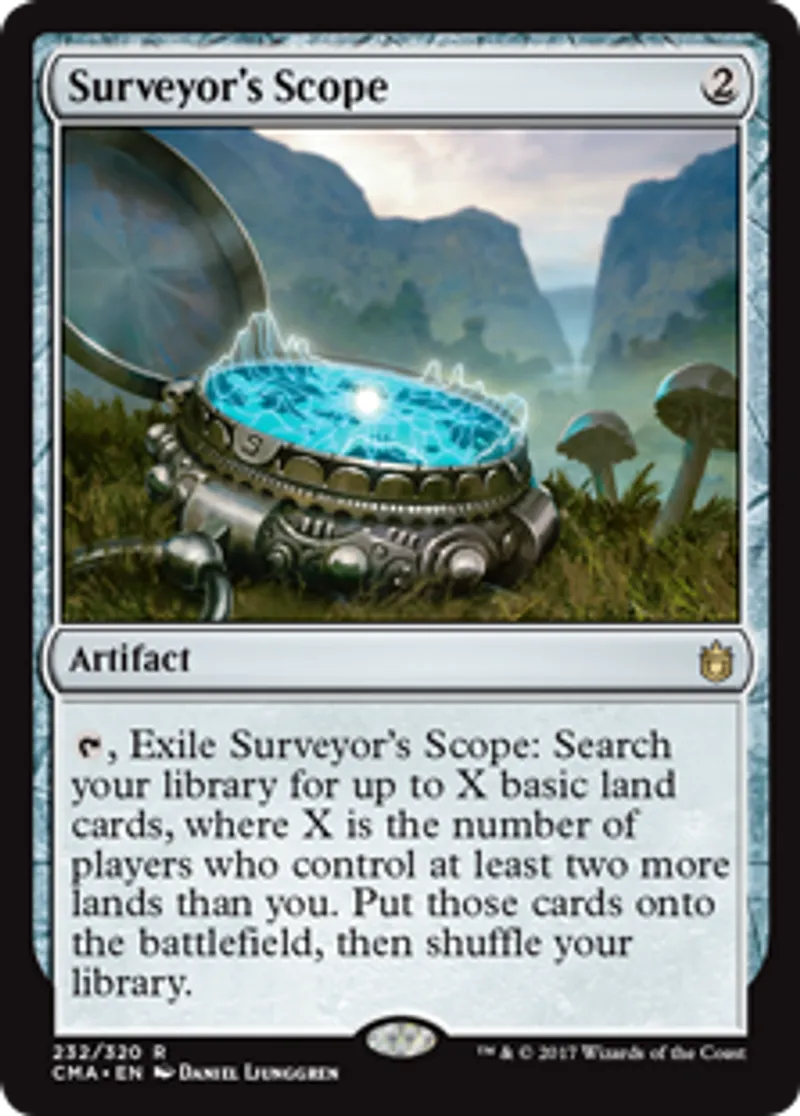 | Oracle Text | {{t}}, Exile Surveyor's Scope: Search your library for up to X basic land cards, where X is the number of players who control at least two more lands than you. Put those cards onto the battlefield, then shuffle your library. | ||
