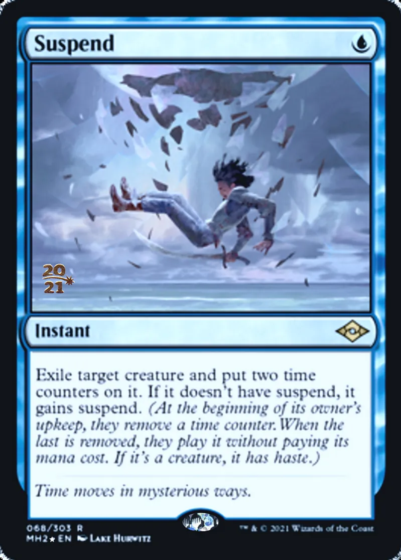 | Oracle Text | Exile target creature and put two time counters on it. If it doesn't have suspend, it gains suspend. (At the beginning of its owner's upkeep, they remove a time counter. When the last is removed, they play it without paying its mana cost. If it's a creature, it has haste.) | ||