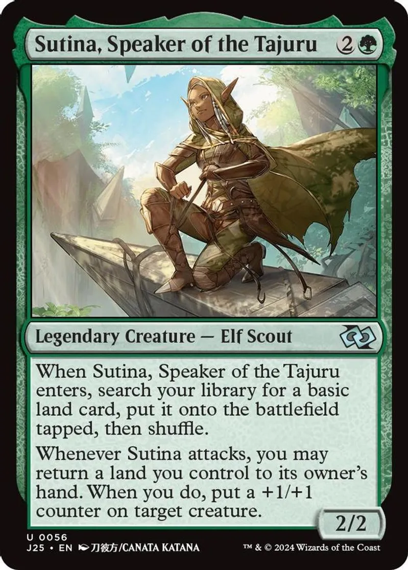 Magic: the Gathering (mtg) Uncommon legendary creature — elf scout Sutina, Speaker of the Tajuru from Foundations Jumpstart (J25) last updated 2026-02-24 15:19:32