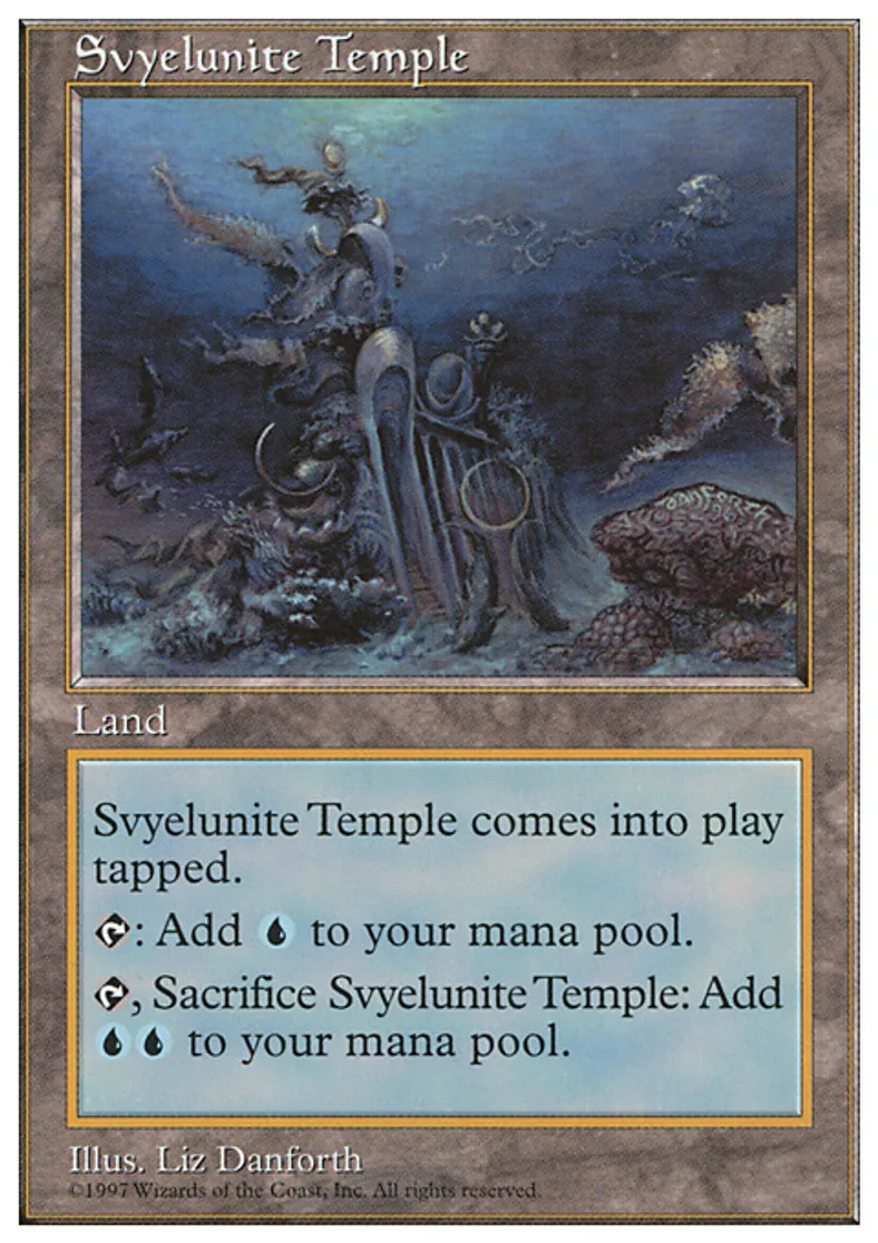 | Oracle Text | Svyelunite Temple enters the battlefield tapped. {{t}}: Add {{u}} to your mana pool. {{t}}, Sacrifice Svyelunite Temple: Add {{u}}{{u}} to your mana pool. | ||