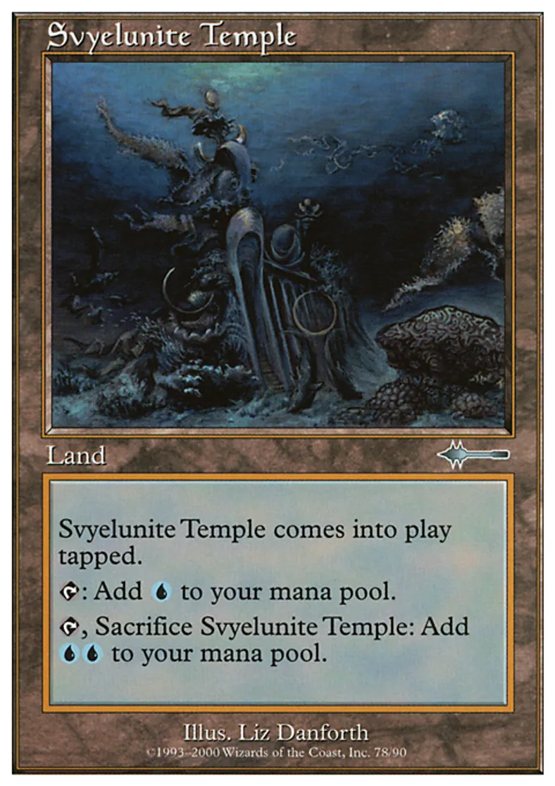 | Oracle Text | Svyelunite Temple enters the battlefield tapped. {{t}}: Add {{u}} to your mana pool. {{t}}, Sacrifice Svyelunite Temple: Add {{u}}{{u}} to your mana pool. | ||