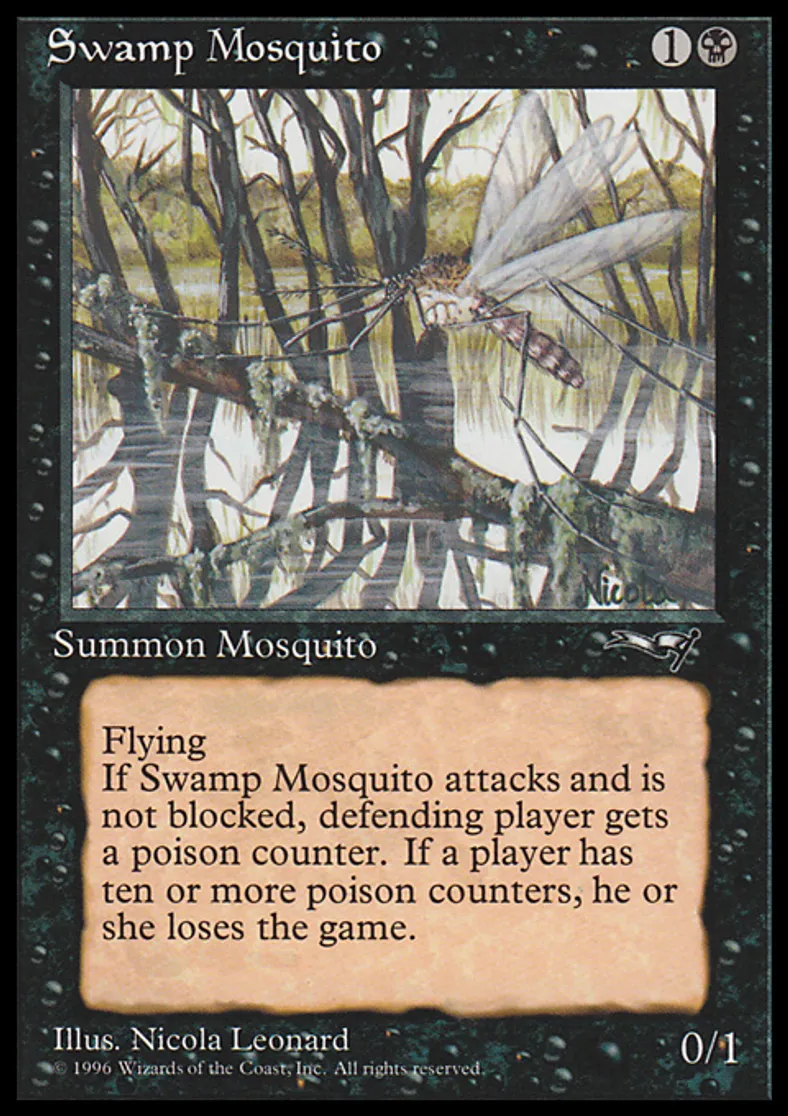| Oracle Text | Flying Whenever Swamp Mosquito attacks and isn't blocked, defending player gets a poison counter. (A player with ten or more poison counters loses the game.) | ||